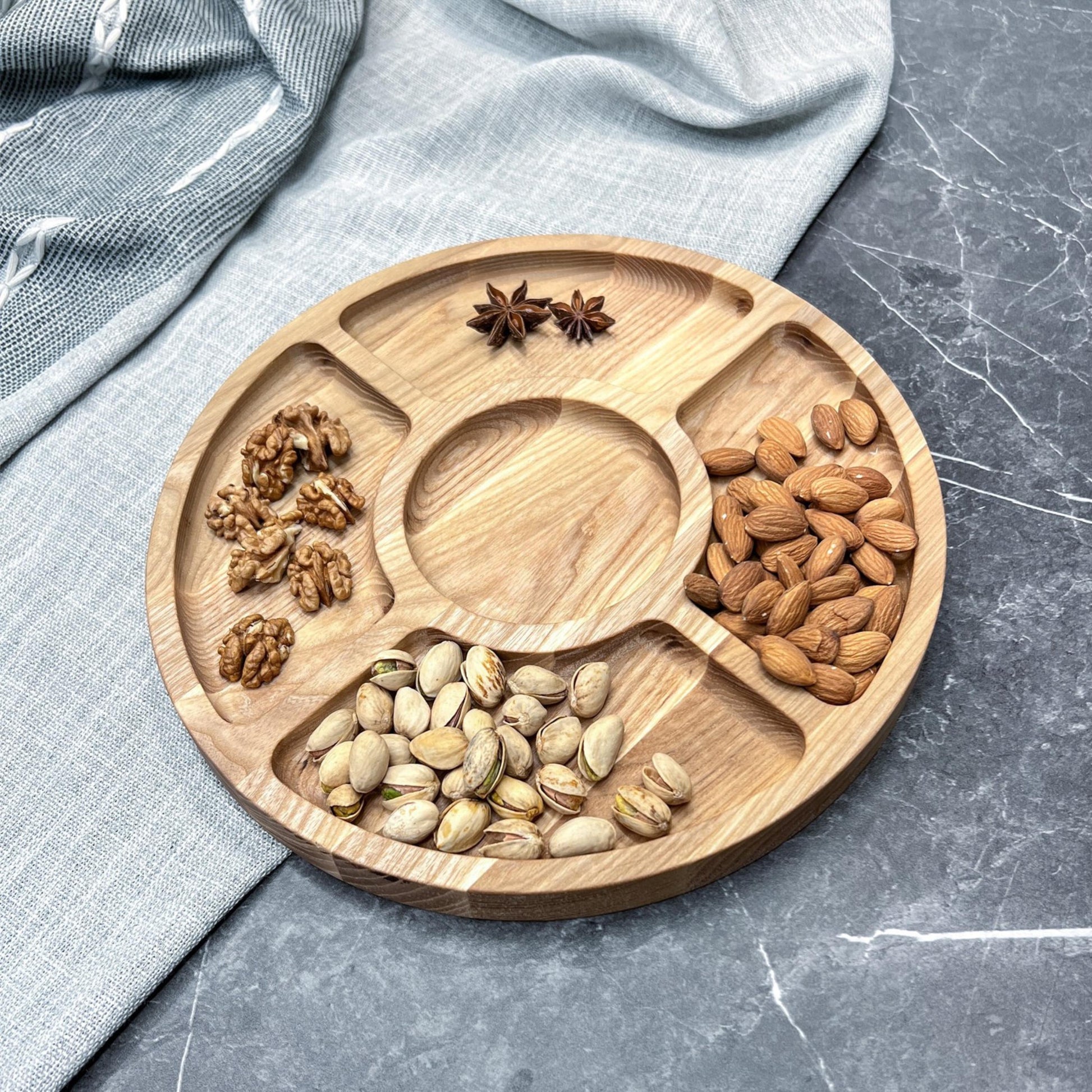 โ Birthday gift โ Anniversary gift โ Housewarming gift โ Fatherโs Day gift โ Motherโs Day gift โ Christmas gift โ Gift for Mum, Dad, Sister, Grandma, Auntie or FriendYou can make this wooden platter even more special by adding a personalised message on either the front or back. Simply enter your message in the personalisation box โ for example: FRONT: Meg's Kitchen; BACK: Happy Birthday, with love from Mum xx. If you prefer not to have any engraving, just select the "No Engraving" option from the dropdown menu and leave the personalisation box blank. on either the front or back. If youโd like any adjustments to the existing design or have a custom request, just send us a message - weโre happy to help! This platter is also available in ๐ฆ๐ฎ๐ฅ๐ญ๐ข๐ฉ๐ฅ๐ ๐ฏ๐๐ซ๐ข๐๐ญ๐ข๐จ๐ง๐ฌ, including designs with 3, 4, or 6 compartments, as well as options without the central bowl section. Please visit our shop to view the full range, or feel free to message us directly โ our stock is updated regularly with new shapes and designs.๐๐๐๐๐๐๐๐๐๐: 28 cm x 28 cm (11 inch x 11 inch) ๐๐๐๐๐๐๐๐ & ๐ ๐๐๐ ๐๐๐ ๐๐๐: Crafted from sturdy ash wood and treated with food-contact oil only, our wooden platters, trays and boards are entirely food-safe and durable for long-lasting use. ๐๐๐๐๐๐๐๐๐ ๐๐๐ ๐๐๐๐๐๐๐๐: Hand wash only, do not use it in a dishwasher, microwave or oven. For maintenance, simply rub a small amount of olive oil, linseed oil, or any mineral food-grade oil onto the surface occasionally to restore its lustre if it begins to dull over time. Each plate exhibits unique variations in colour and grain due to the handmade nature of the product. The photo may be slightly different from the actual item in terms of colour due to the lighting during photo shooting or the monitor's display. THANK YOU FOR YOUR PURCHASE AND FOR SUPPORTING OUR SMALL FAMILY BUSINESS!