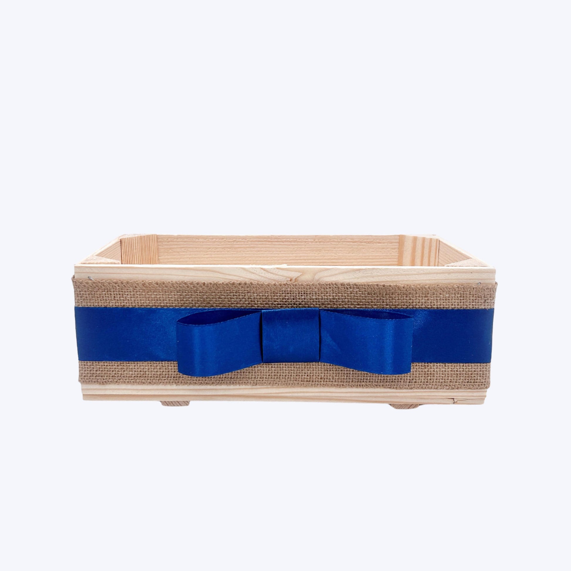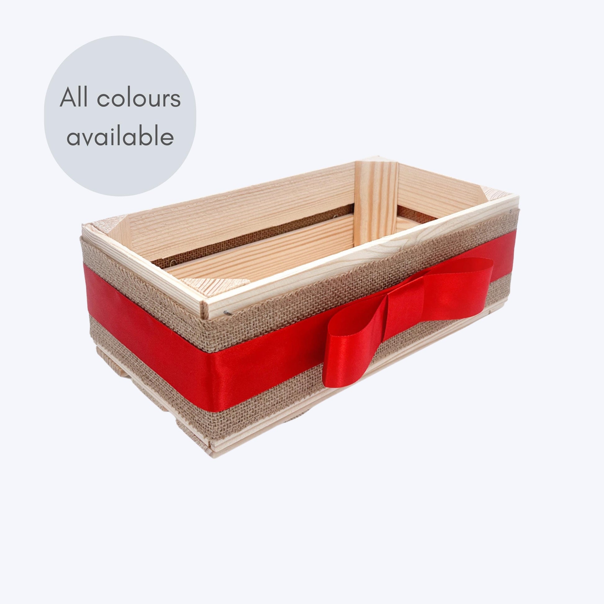 HANDMADE EMPTY RUSTIC WOODEN CRATE - GIFT BOX BASKET - MAKE YOUR OWN HAMPER - DIY KIT FOR GIFTS (DECORATED WITH SATIN RIBBON)Size: 30 x 15 x 11 cm / 11.81 x 5.91 x 4.33 inchesUnique and sturdy wooden crate, beautifully decorated with natural hessian fabric and satin ribbon and perfect to create your own hamper for any occasion (anniversary, birthday, housewarming, wedding, Mother's Day, Father's Day, Charity raffle, Christmas and Easter hampers, Valentine's Day, baby shower, retirement, etc.) Our crates and hampers are perfect to fill with wine, cheeses, chutneys and many other artisanal delicacies (or any other lovely items of your choice). The gift baskets are available in different sizes and different ribbon colours - please check our shop or contact us directly for more similar products.Note: The contents in the picture are not included and are just to give you an idea of what can fit in the crate. THANK YOU FOR YOUR PURCHASE!