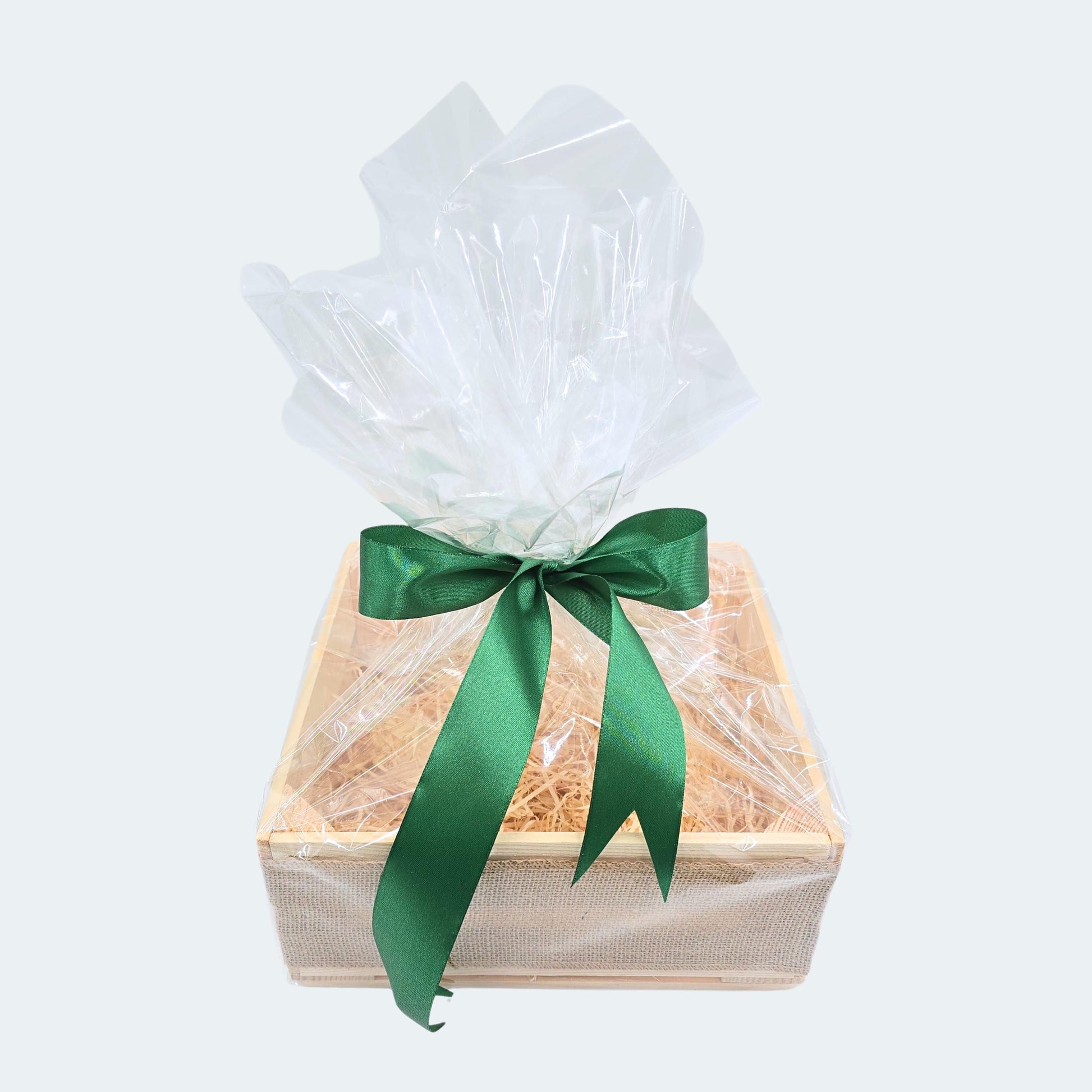 - Crate only - Crate and hamper filling - Full Kit - crate, filling, cellophane (1 metre / 39 inch) and ribbon (1 metre / 39 inch) - please choose the colour of the ribbon from the drop down list. Size: 24 cm x 24 cm x 11 cm (9.44 inch x 9.44 inch x 4.3 inch)The ribbon for this gift basket is available in a wide variety of beautiful colours to suit any occasion or theme, including gold, moss green, rose gold, sage green, white, dusty blue, burgundy, champagne, dusty rose, dusty sage, and forest green.Unique and sturdy wooden crate, beautifully decorated with natural hessian fabric and perfect to create your own hamper for any occasion (anniversary, birthday, housewarming, wedding, corporate gifts, Mother's Day, Father's Day, Charity raffle, Christmas hampers, Easter hampers, Valentine's Day, baby shower, retirement, etc.) NOTE: The contents in the picture are not included and are just to give you an idea of what can fit in the crate. THANK YOU FOR YOUR PURCHASE!