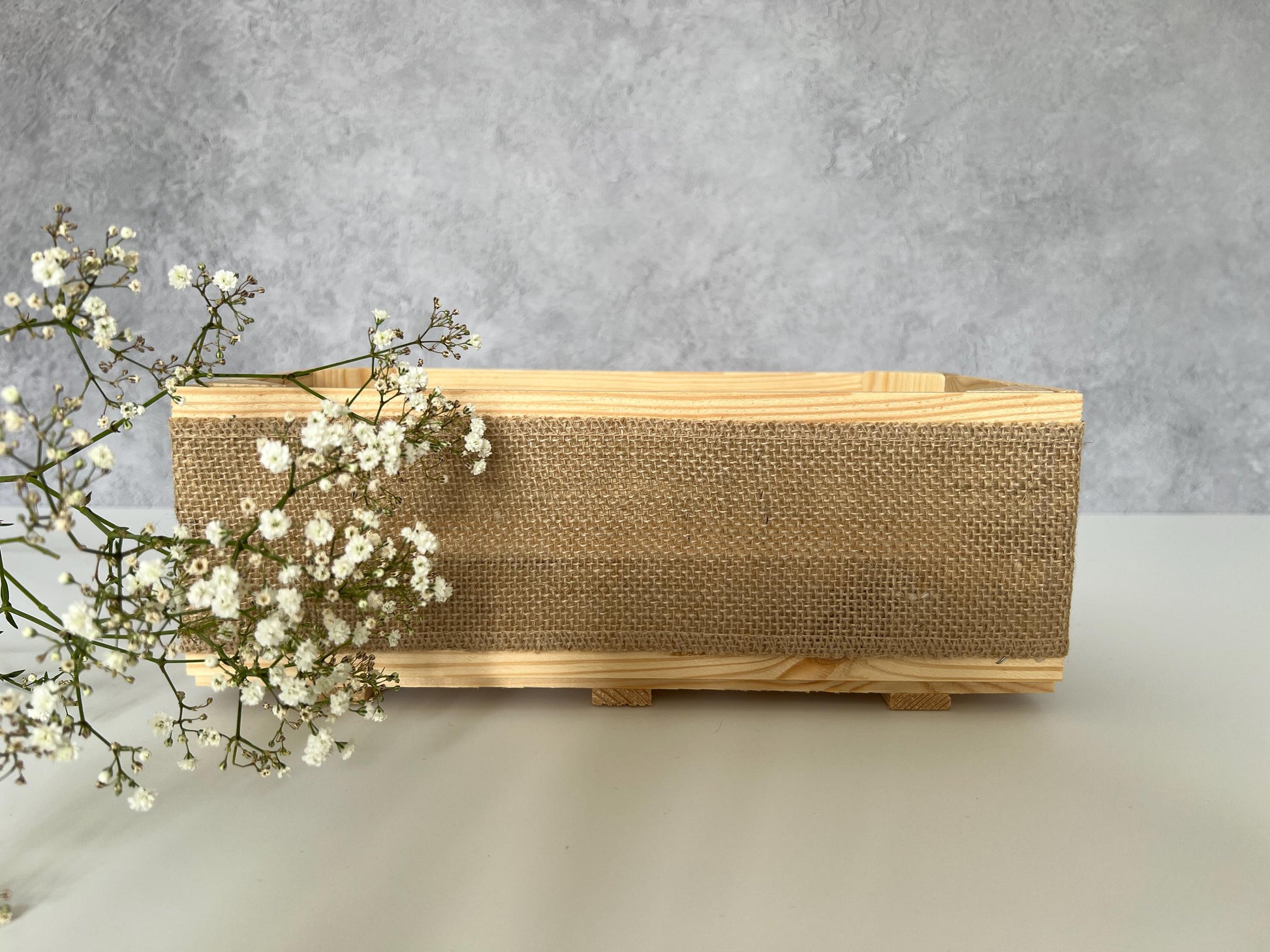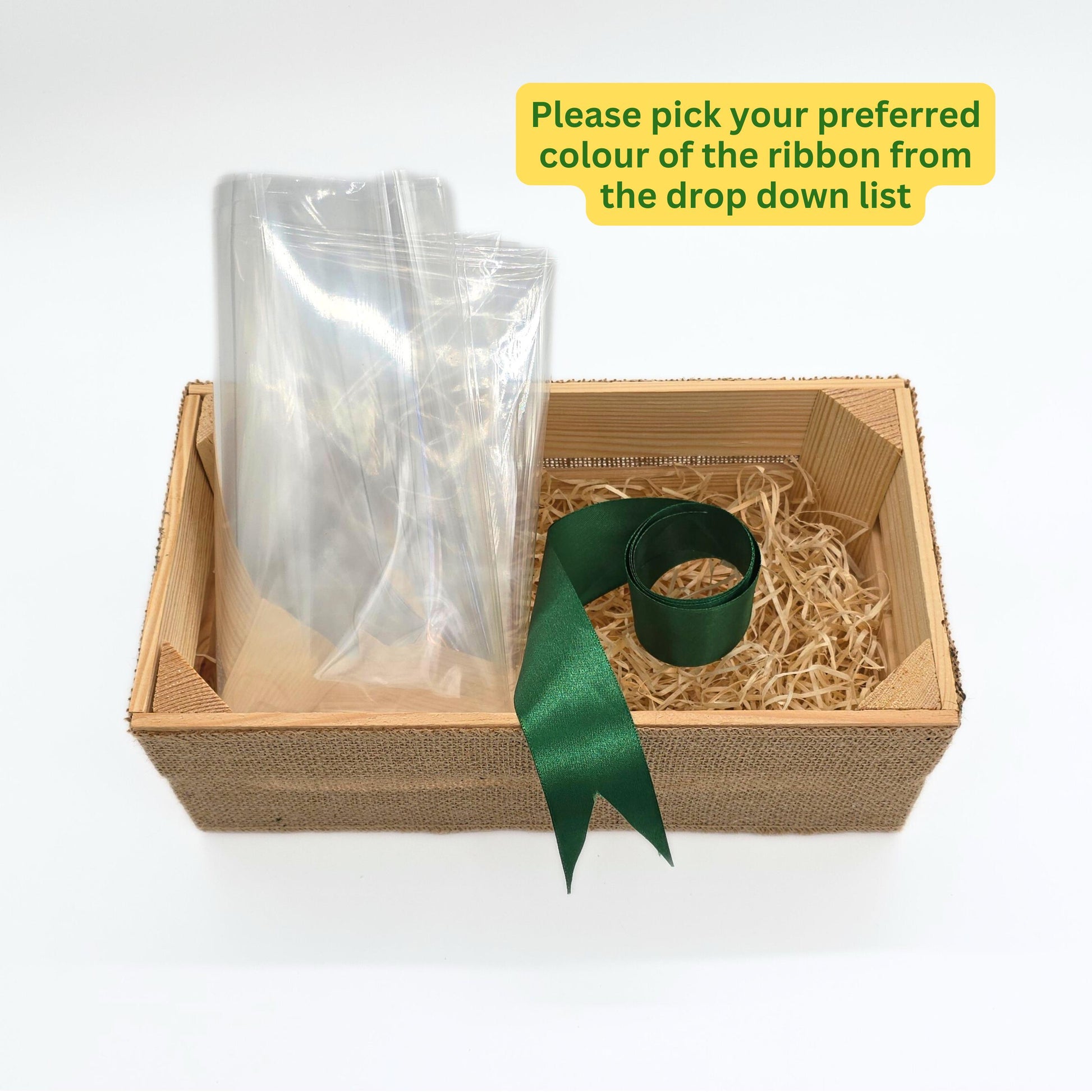 - Crate only - Crate and hamper filling - Full Kit - crate, filling, cellophane (1 metre / 39 inch) and ribbon (1 metre / 39 inch) - please choose the colour of the ribbon from the drop down list. Size: 30 x 15 x 11 cm (11.8 inch x 5.9 inch x 4.3 inch)Unique and sturdy wooden crate, beautifully decorated with natural hessian fabric and perfect to create your own hamper for any occasion (anniversary, birthday, housewarming, wedding, corporate gifts, Mother's Day, Father's Day, Charity raffle, Christmas hampers, Easter hampers, Valentine's Day, baby shower, retirement, etc.) NOTE: The contents in the picture are not included and are just to give you an idea of what can fit in the crate. More beautifully decorated crates and gift baskets are available in our shop here: https://www.etsy.com/uk/shop/AboutWoodUK?section_id=50719620THANK YOU FOR YOUR PURCHASE!