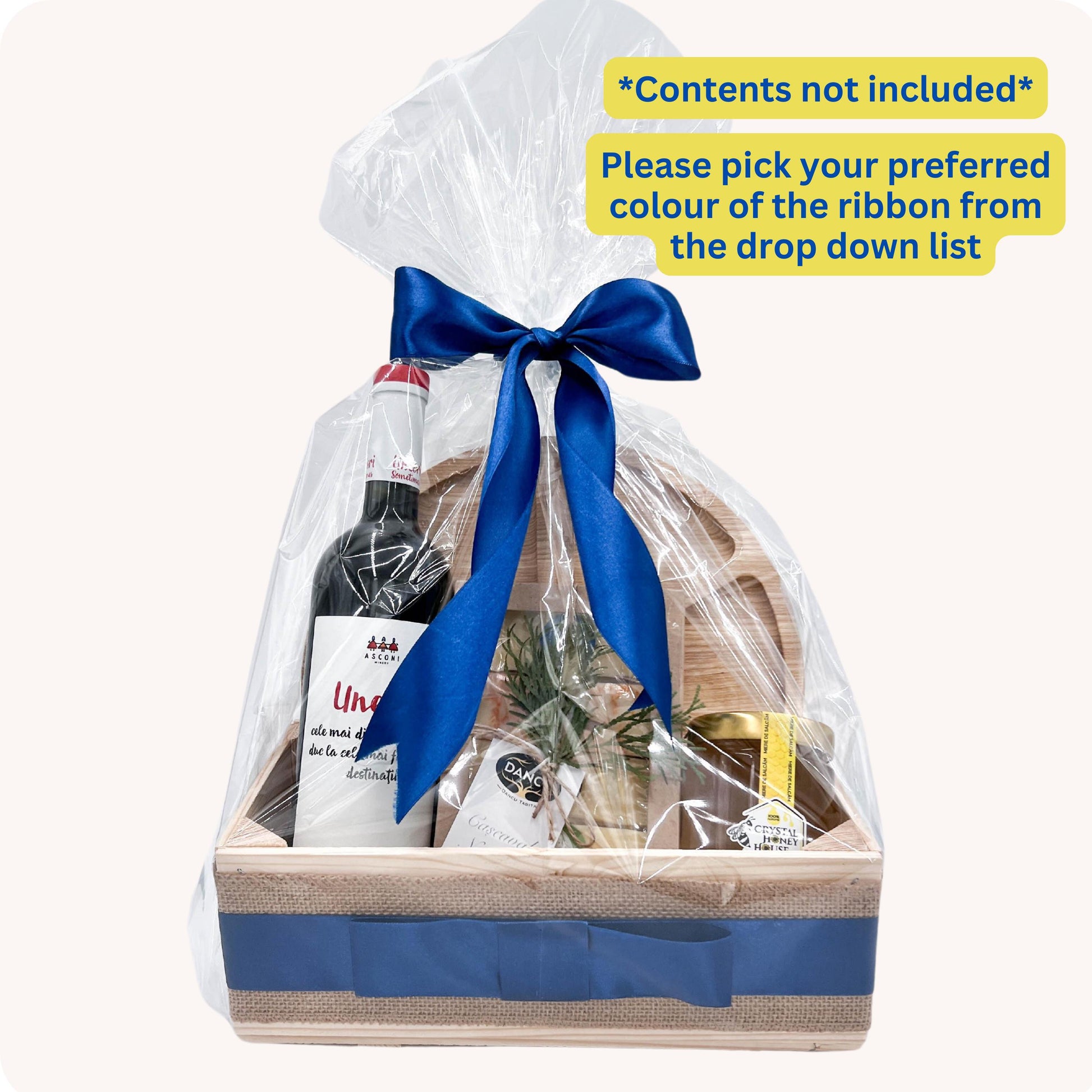 - Crate only - Crate and hamper filling - Full Kit - crate, filling, cellophane (1 metre / 39 inch) and ribbon (1 metre / 39 inch) - please choose the colour of the ribbon from the drop down list. NOTE: The contents in the picture are not included and are just to give you an idea of what can fit in the crate. Our crates and hampers are perfect to fill with wine, cheeses, chutneys and many other artisanal delicacies (or any other lovely items of your choice) and can be paired with our eco-friendly handmade wooden platters (a few examples below or visit our shop to see more products):https://www.etsy.com/uk/listing/1766771014/round-wooden-platter-charcuterie-board https://www.etsy.com/uk/listing/1760451648/wooden-tea-and-biscuit-wood-tray-with https://www.etsy.com/uk/listing/1787981399/empty-make-your-own-wooden-crate-hamperPlease do not hesitate to use check out our shop for other similar products – our stock is being updated regularly.THANK YOU FOR YOUR PURCHASE!