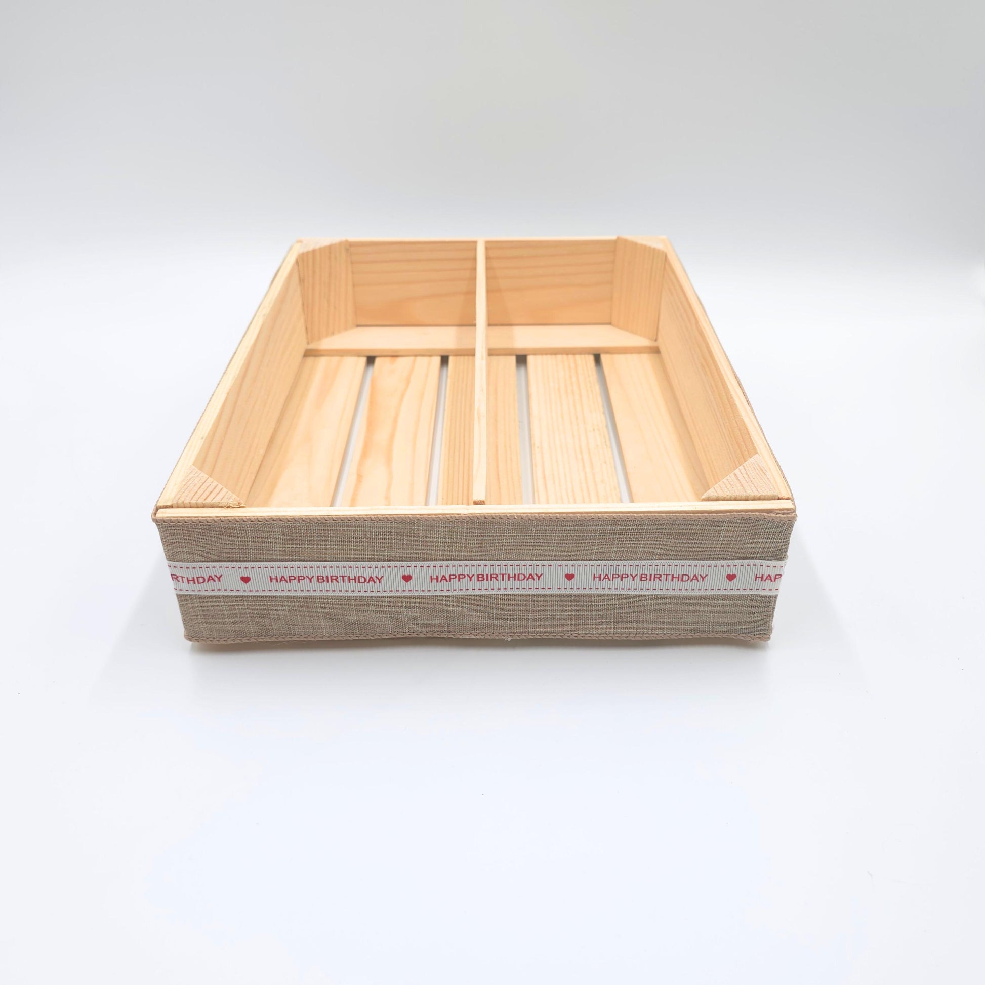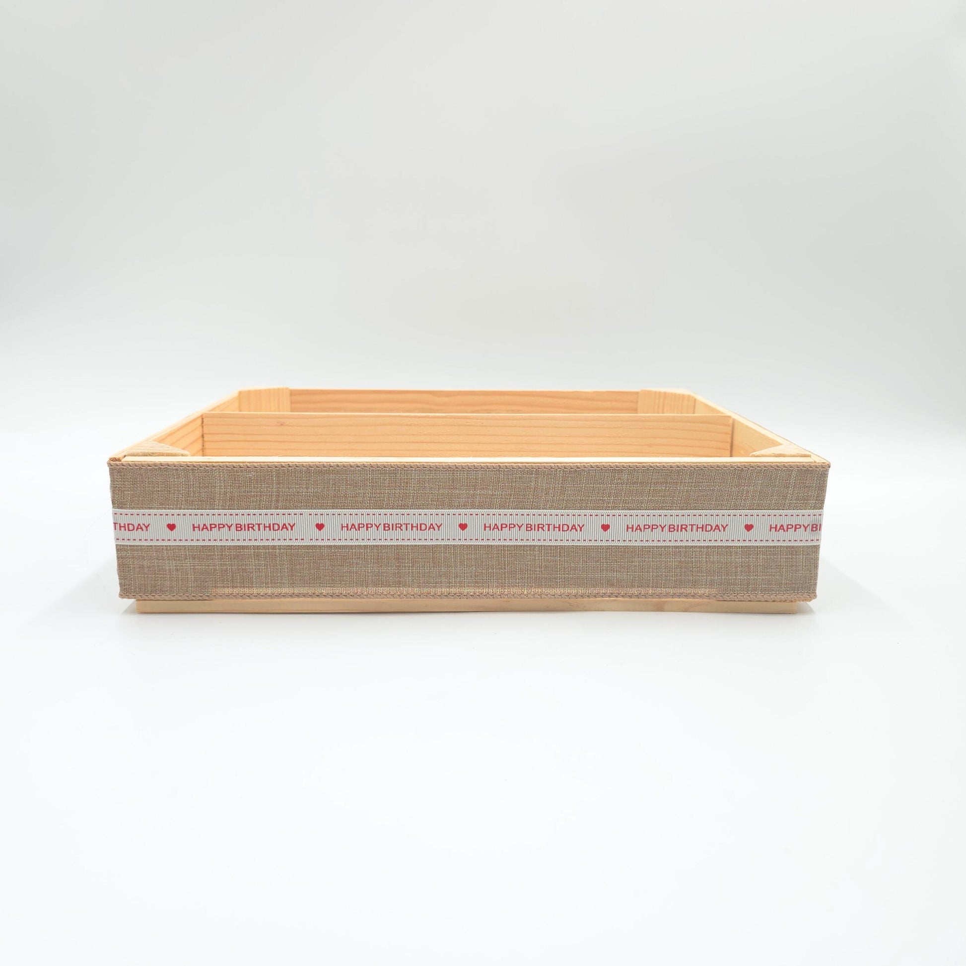 EMPTY WOODEN CRATE AND WINE BASKET - HAPPY BIRTHAY GIFT BASKET - MAKE YOUR OWN HAMPER - GIFT BOX - DIY KIT FOR GIFTS Size: 31 x 24 x 7 cm (12.2 inch x 9.44 inch x 2.75 inch)**Please mention it in the personalization box if you want some hamper filling/straw to be added**Unique and sturdy handmade wooden crate with or without two compartments (choose from the drop down list), beautifully decorated with premium quality fabric featuring a festive 'Happy Birthday' inscription. Ideal for creating a personalized hamper for a birthday occasion, it’s perfect for holding any special items of your choice, including wine bottles, cheeses, gourmet jars, candles etc.This gift basket can be wrapped in cellophane, tied with a ribbon, and personalized with a greeting card, making it a thoughtful gift presentation.NOTE: The contents in the picture are not included and are just to give you an idea of what can fit in the crate. THANK YOU FOR YOUR PURCHASE!