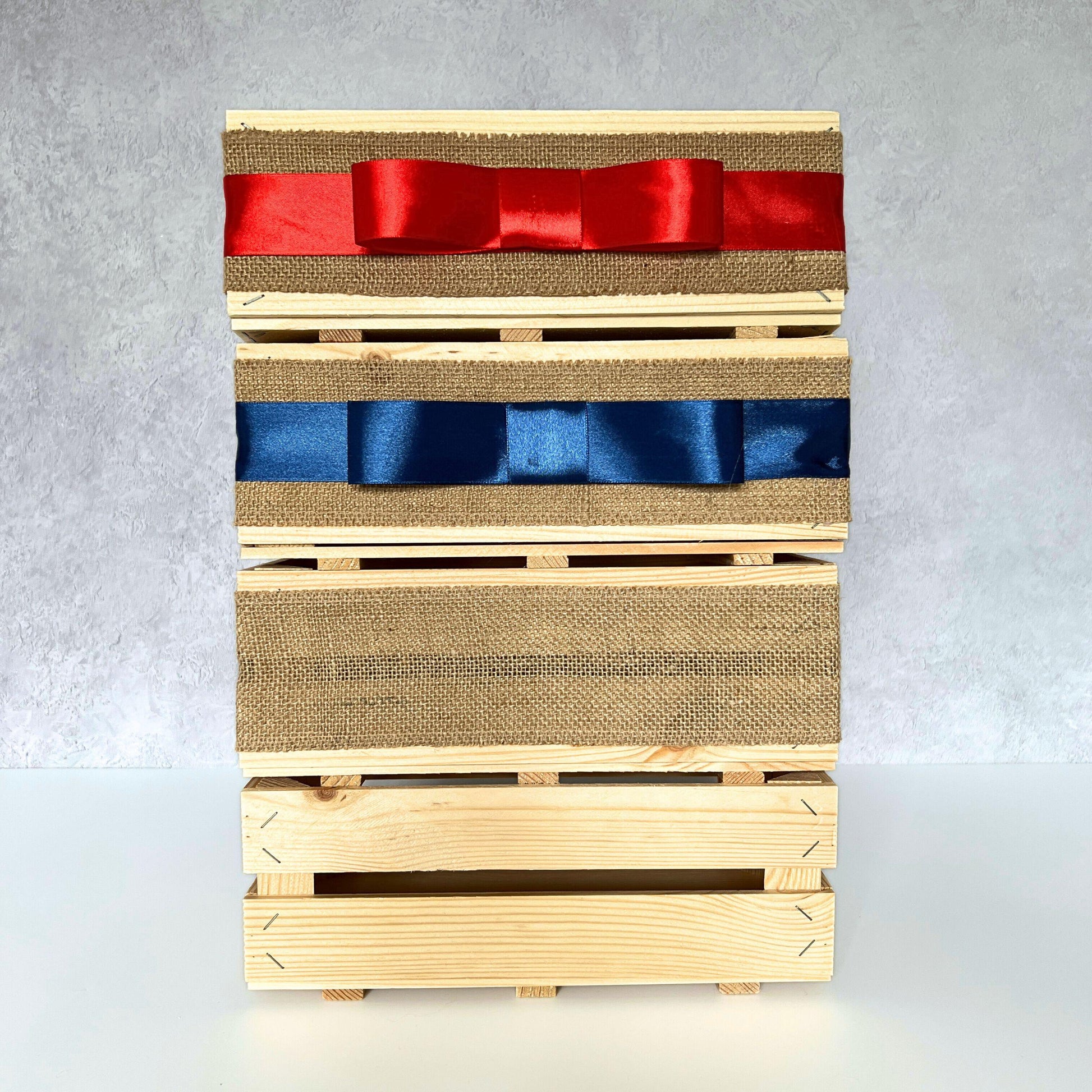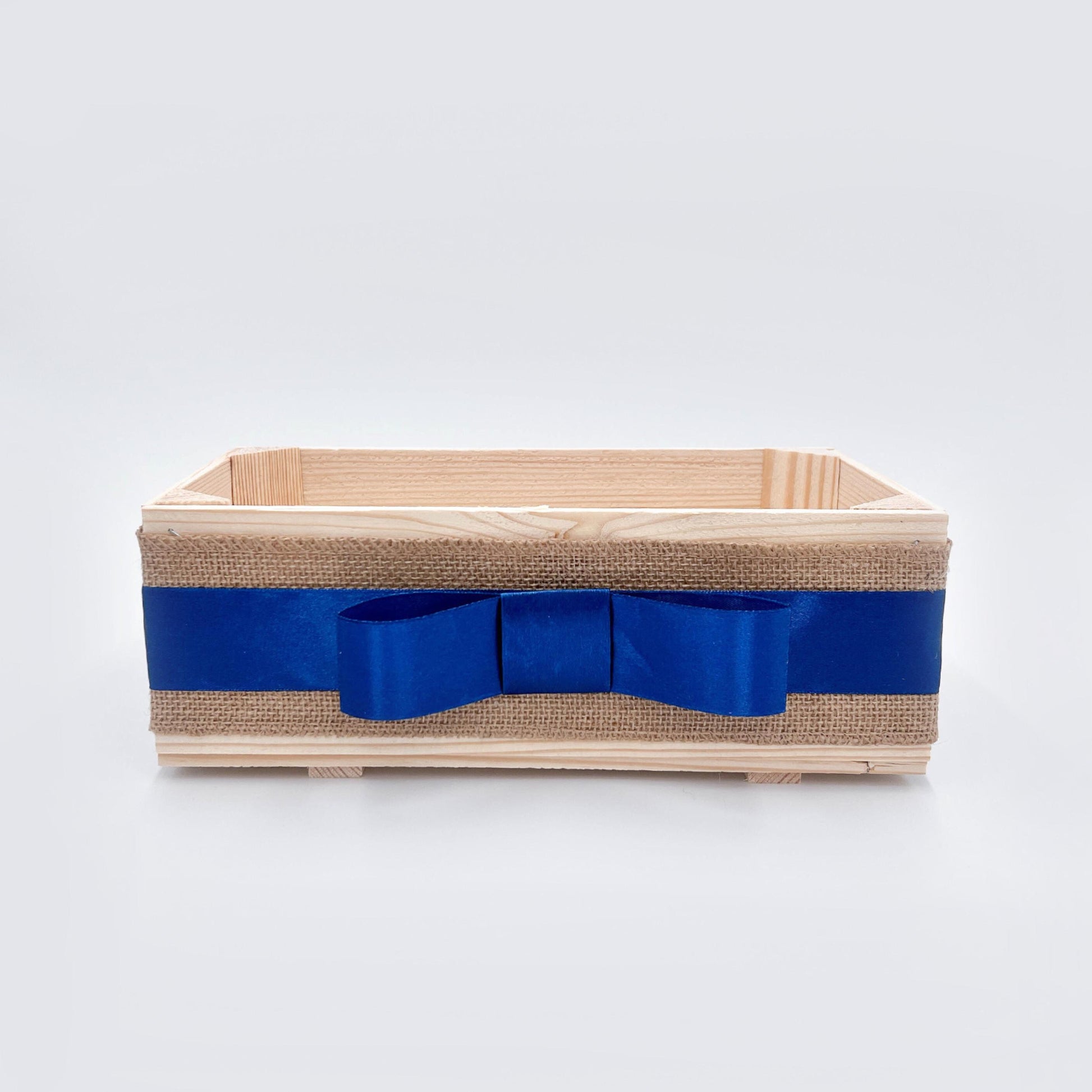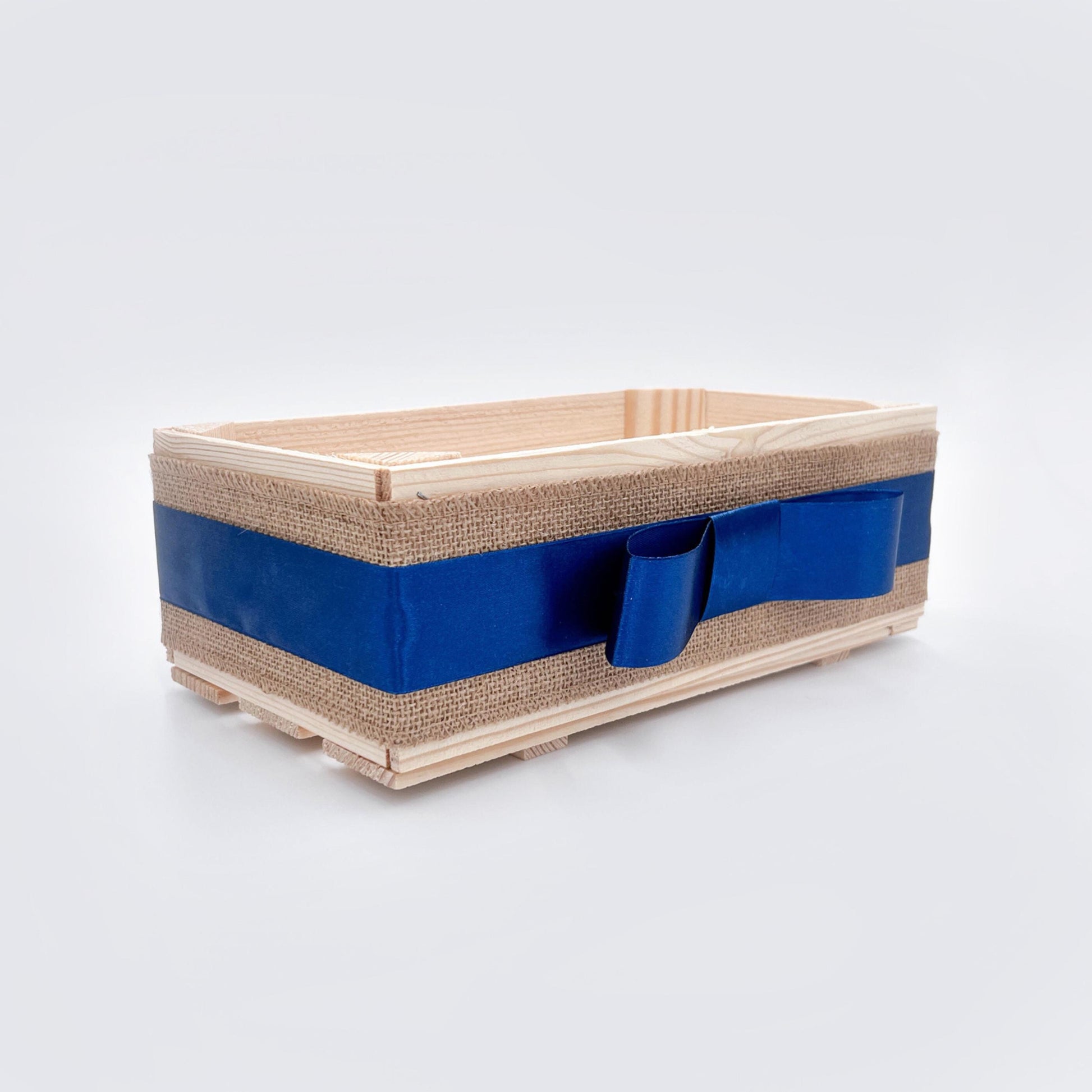 MAKE YOUR OWN HAMPER KIT - EMPTY BLUE WOODEN CRATE - GIFT BASKET - DIY KIT FOR GIFTS (DECORATED WITH BLUE RIBBON)Size: 30 cm x 15 cm x 11 cm (11.80 inch x 5.90 inch x 4.33 inch)*The full kit includes the crate, filling, cellophane and ribbon.Unique and sturdy wooden crate, beautifully decorated with natural hessian fabric and blue satin ribbon and perfect to create your own hamper for any occasion (anniversary, birthday, housewarming, wedding, Mother's Day, Father's Day, Charity raffle, Christmas and Easter hampers, Valentine's Day, baby shower, retirement, etc.) Our crates and hampers are perfect to fill with wine, cheeses, chutneys and many other artisanal delicacies (or any other lovely items of your choice). The gift baskets are available in different sizes and different ribbon colours - please check our shop or contact us directly for more similar products.Note: The contents in the picture are not included and are just to give you an idea of what can fit in the crate. THANK YOU FOR YOUR PURCHASE!