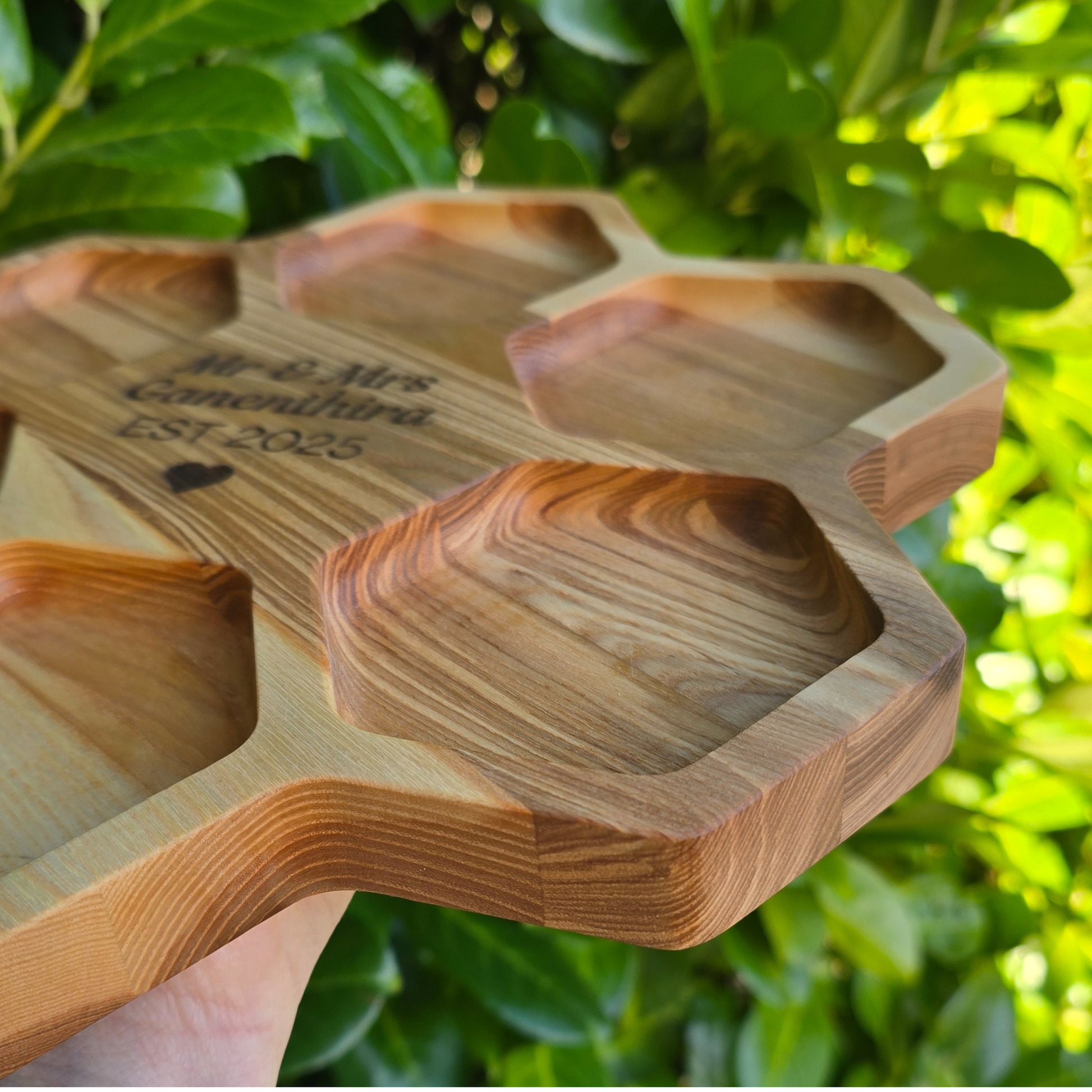 This honeycomb-shaped wooden platter is a delightful gift for nature and bee lovers, as well as a thoughtful choice for a housewarming or a wedding anniversary, especially a wooden wedding anniversary. It works beautifully as a snack tray, cheese board, vibrant charcuterie board, or a unique table centerpiece. Featuring multiple compartments, this divided platter is also ideal for serving dips, offering endless ways to present food and impress your guests.