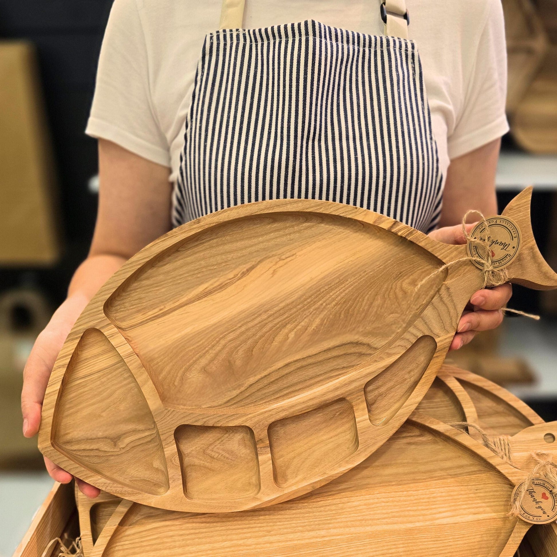 Personalised wooden fish-shaped serving board – engraved charcuterie platter